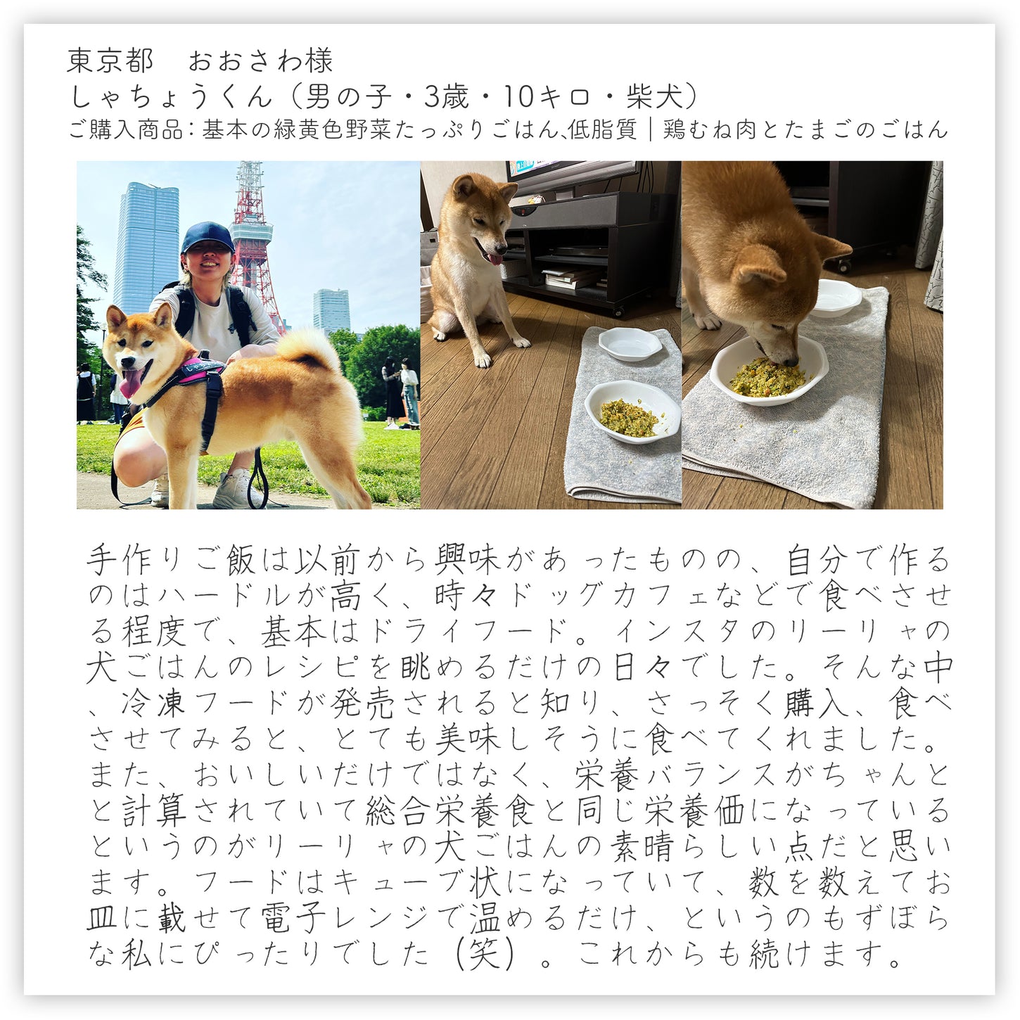 フードに含まれる1日分のカロリーの10%程度をリーリャの犬ごはんに置き換えてください。