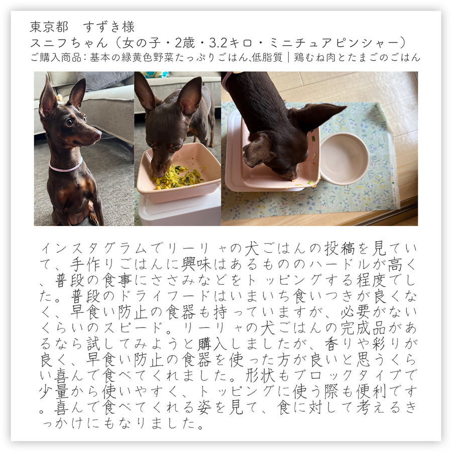 ペット栄養管理士が考案、栄養計算の専門家である管理栄養士が監修した手作り犬ごはんブランドで、フレッシュタイプの手作り犬ごはんと犬専用サプリメントを販売しています。Instagramなどで手作り犬ごはんレシピを公開しており、レシピ投稿数100、SNS総フォロワー数は2万人を超えています。リーリャの犬ごはんで取り扱っている商品はフォロワーの方の悩みを解決することを目的に開発しています。