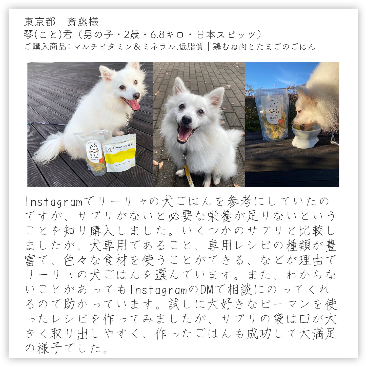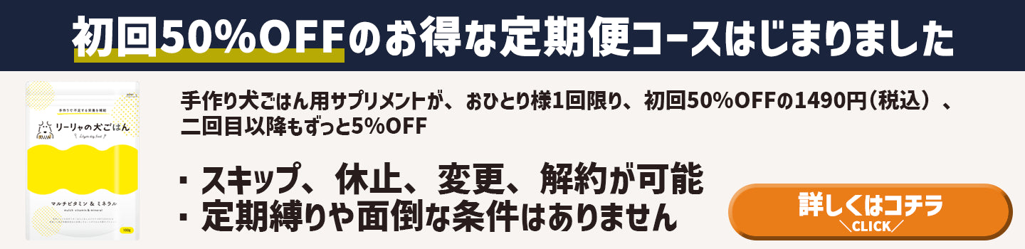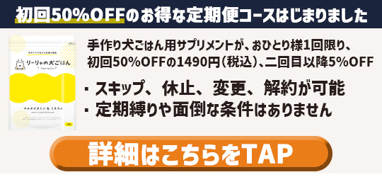これらの栄養素は気にしていないと特に不足しがちなものです。できるだけ総合栄養食かAAFCOの栄養基準を満たしているものを食べさせてあげてください。リーリャの犬ごはんの手作り犬ごはん専用サプリメントなら栄養基準を満たした専用レシピもセットでご提供しています。